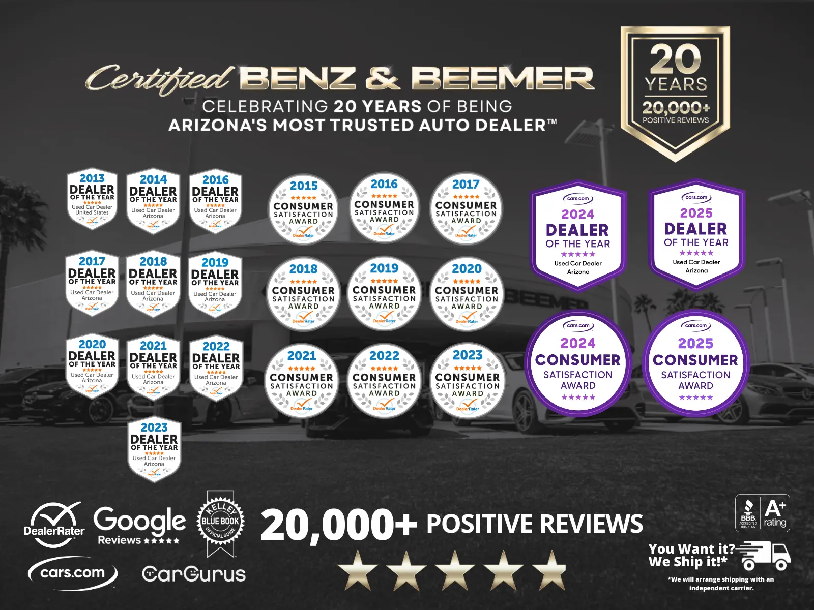 Certified Benz & Beemer is a family-owned business that has been the largest pre-owned luxury vehicle dealership in Arizona for the last twenty (20) years. At Certified Benz & Beemer, we offer the highest quality, pre-owned vehicles in a friendly, zero pressure, environment which we believe will be the best car buying experience you ever have.